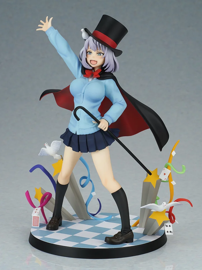 From BellFine and sculpted by Momofusa comes this 1/7 scale figure of “Magic-chan” Sempai from Magical Sempai. Measuring 9.3”, she stands boldly on a blue and white checkerboard base with colorful ribbons, stars, playing cards, and doves bursting forward! As usual, from all her exuberance combined with her stage fright, she’s accidentally flashing her audience her butt again. Her big smile and bright blue eyes have been clearly painted, and her snug blue sweater has been carefully sculpted around her curvy body. A cute addition is the dove in her hair! Let her practice performing her magic tricks in your collection!